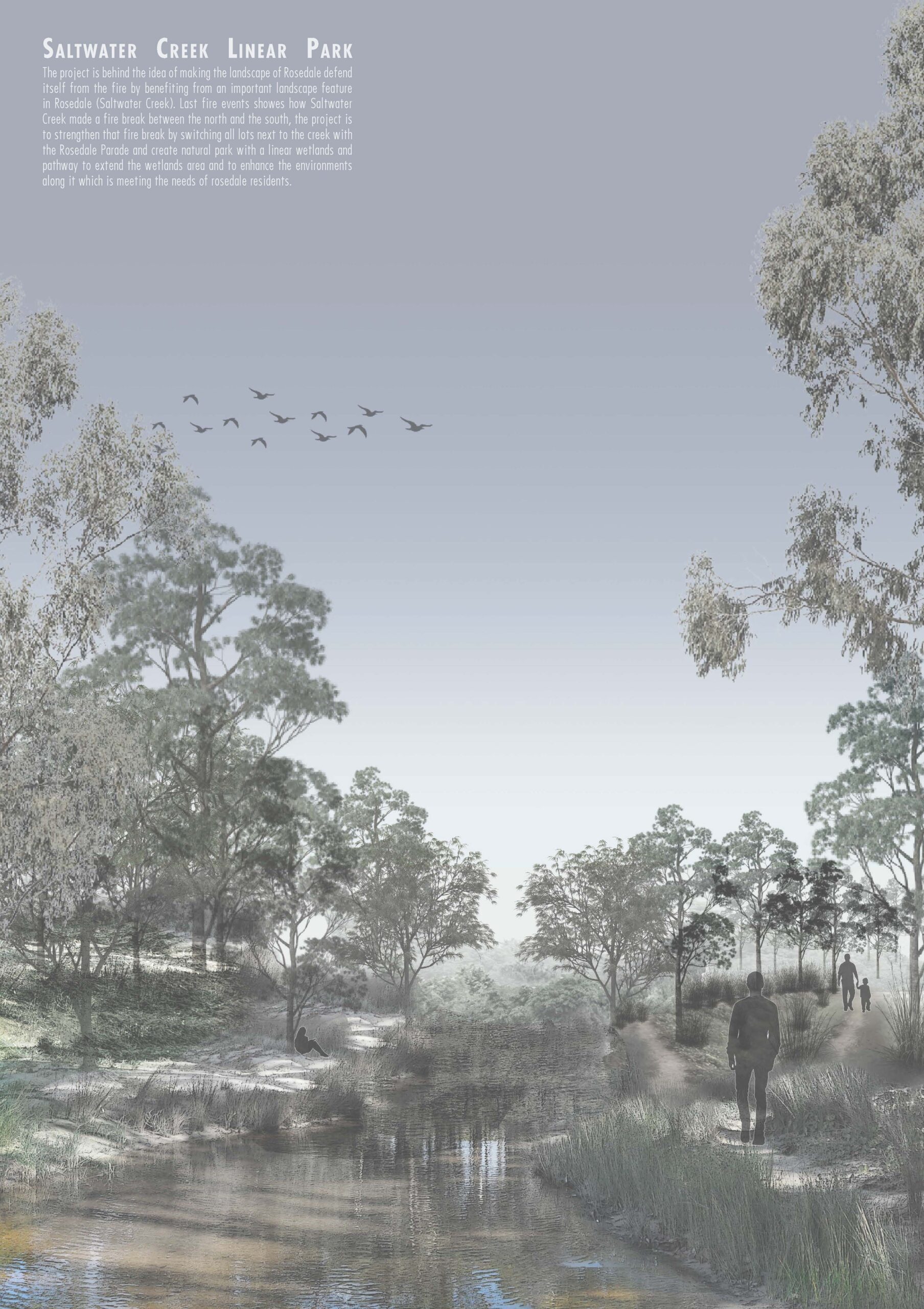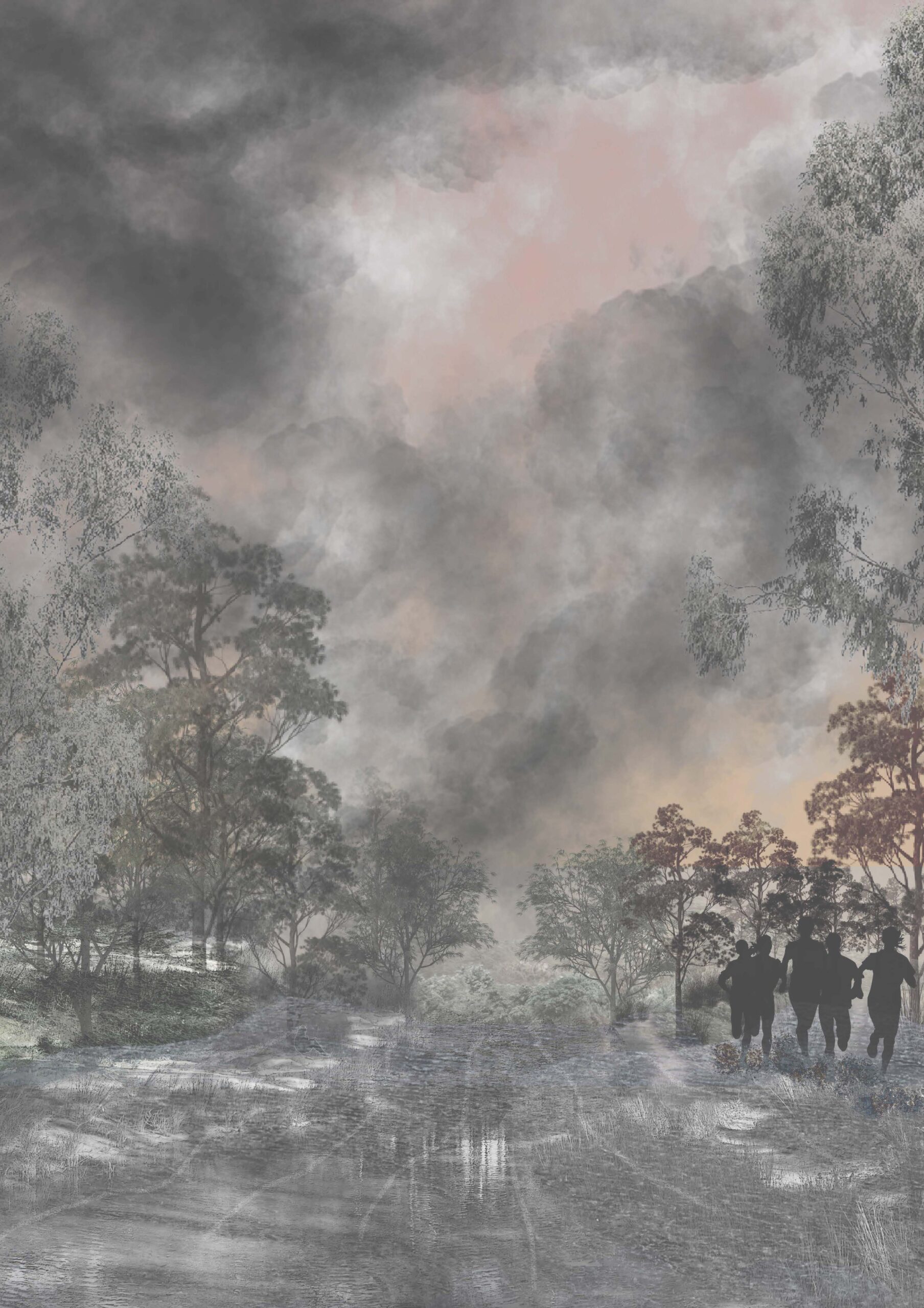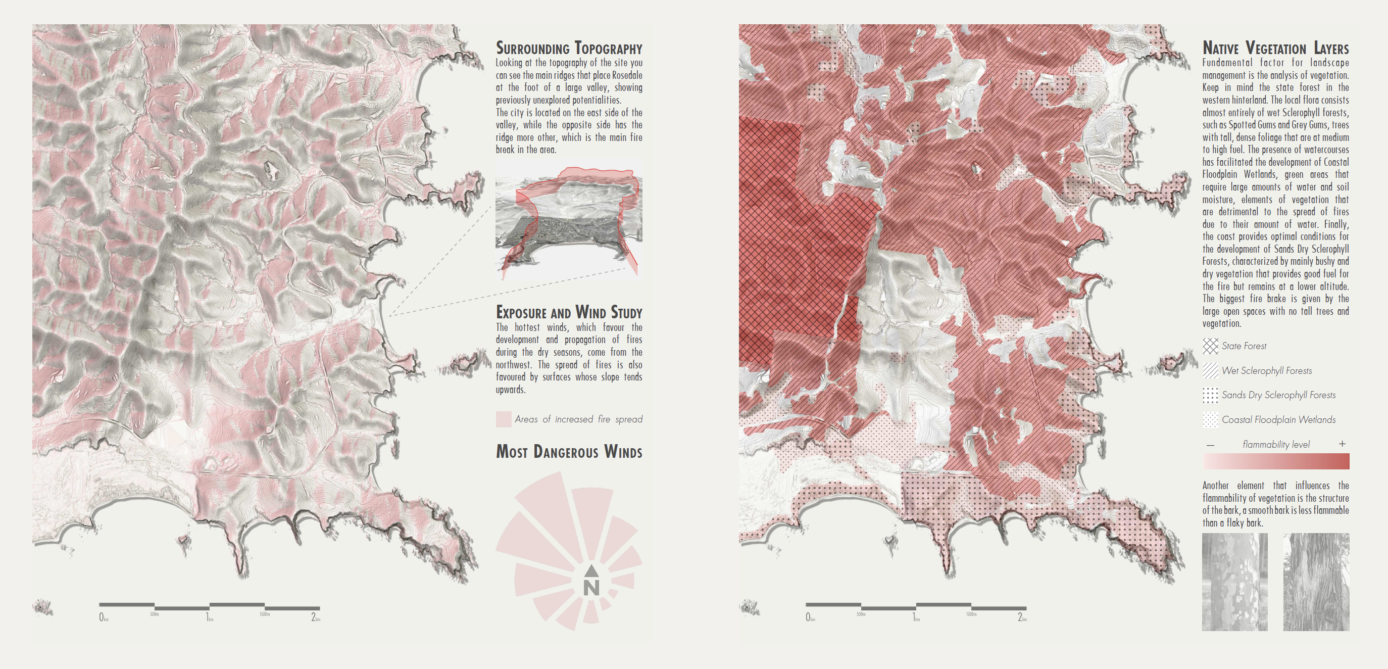 The 2019/2020 bushfire season showcased a strong necessity for improvements in community resiliency, and revealed the capabilities of individuals and groups to plan and adapt. This project explores the formation of ‘zones of care’ that emerged naturally during the fire. These zones organise the people of rosedale to work as a collective under a shared acknowledgement of responsiblity for land and place; and active collaboration in sharing, storing, and organising resources for resiliency with landscape.