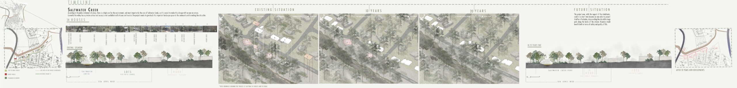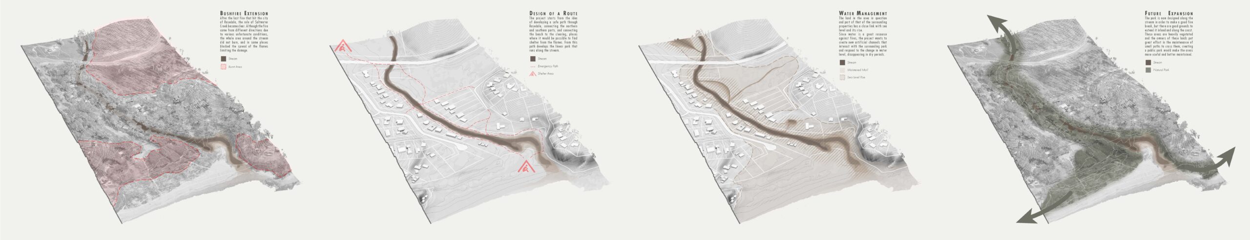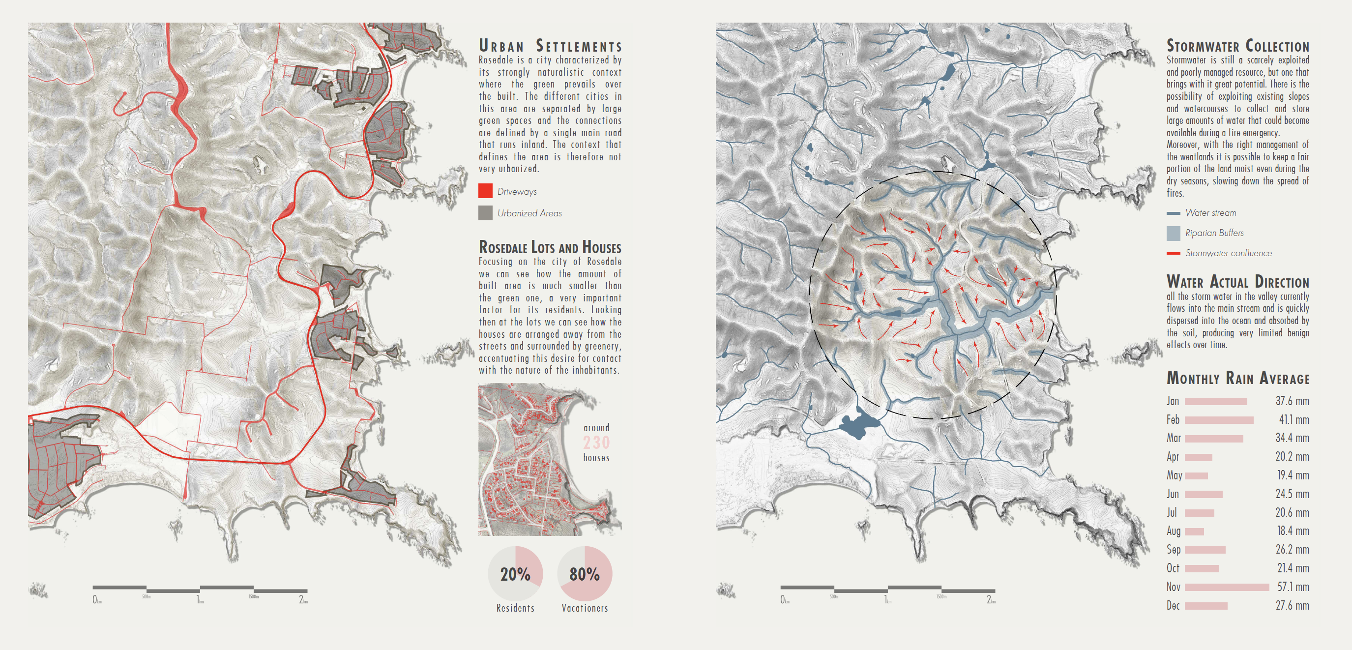 The 2019/2020 bushfire season showcased a strong necessity for improvements in community resiliency, and revealed the capabilities of individuals and groups to plan and adapt. This project explores the formation of ‘zones of care’ that emerged naturally during the fire. These zones organise the people of rosedale to work as a collective under a shared acknowledgement of responsiblity for land and place; and active collaboration in sharing, storing, and organising resources for resiliency with landscape.